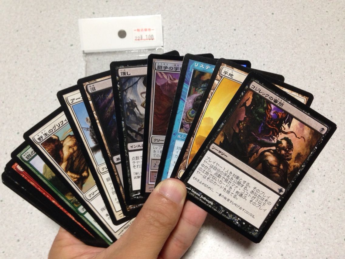 基本地形やトークンや宣伝カードが適当に混じっているところを見ると、店員さんはマジックのことをほとんど知らない。そして時代的にはゼンディカー~ミラディンあたり。ゼンディカーブロックといえば、絶版ブースターランキングで2位~4位を独占する良エキスパンション(リンク)。これなら期待できるかも!