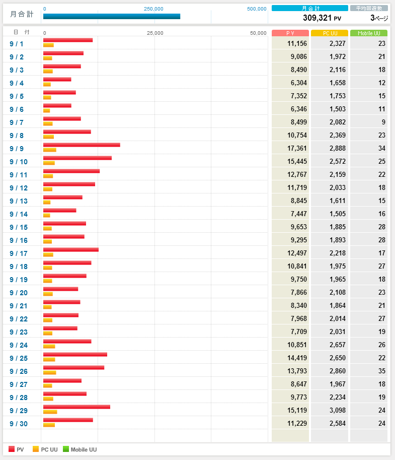 1日あたり2件の記事を書き、毎日1万PVほどでした。